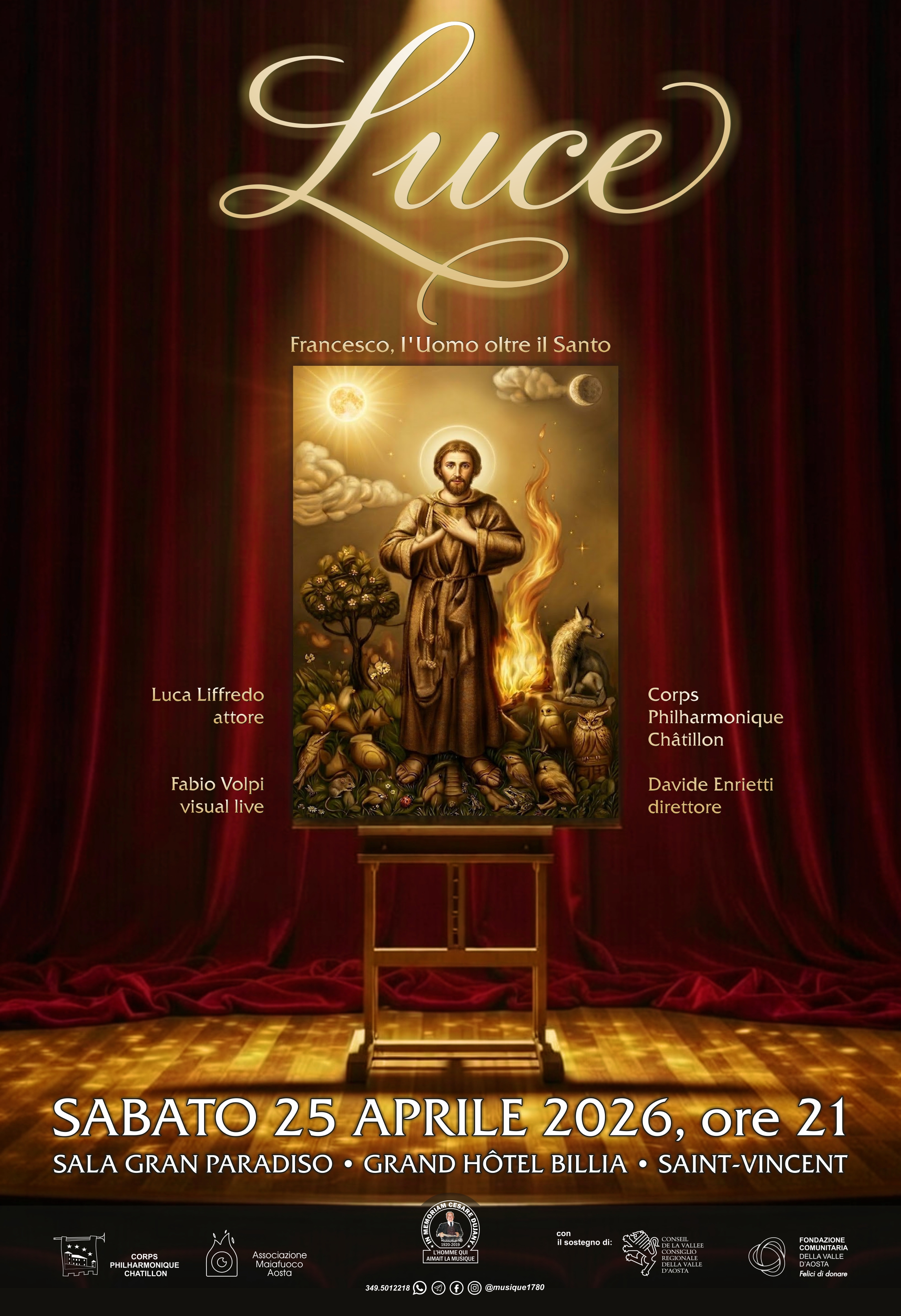 “LUCE, Francesco, l’uomo oltre il Santo” è un concerto-spettacolo che unisce musica, teatro e installazioni luminose. L’iniziativa è proposta dal Corps Philharmonique de Châtillon con la compagnia Maiafuoco e il visual artist Fabio Volpi.